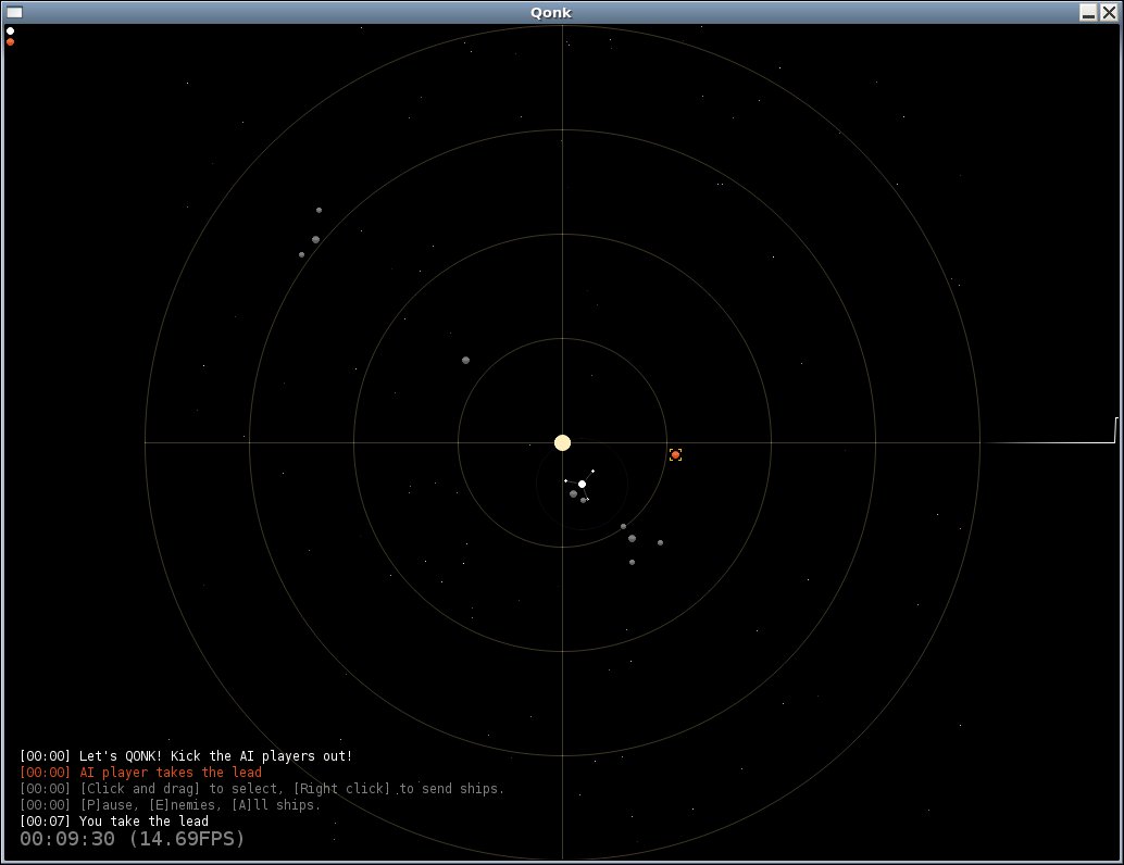 Qonk is a small game I wrote to learn some SDL basics. The game is a small build-and-conquer strategy game with very simple rules. A complete game only lasts for a few minutes and can be a fun break away from work or whatever you’re doing.